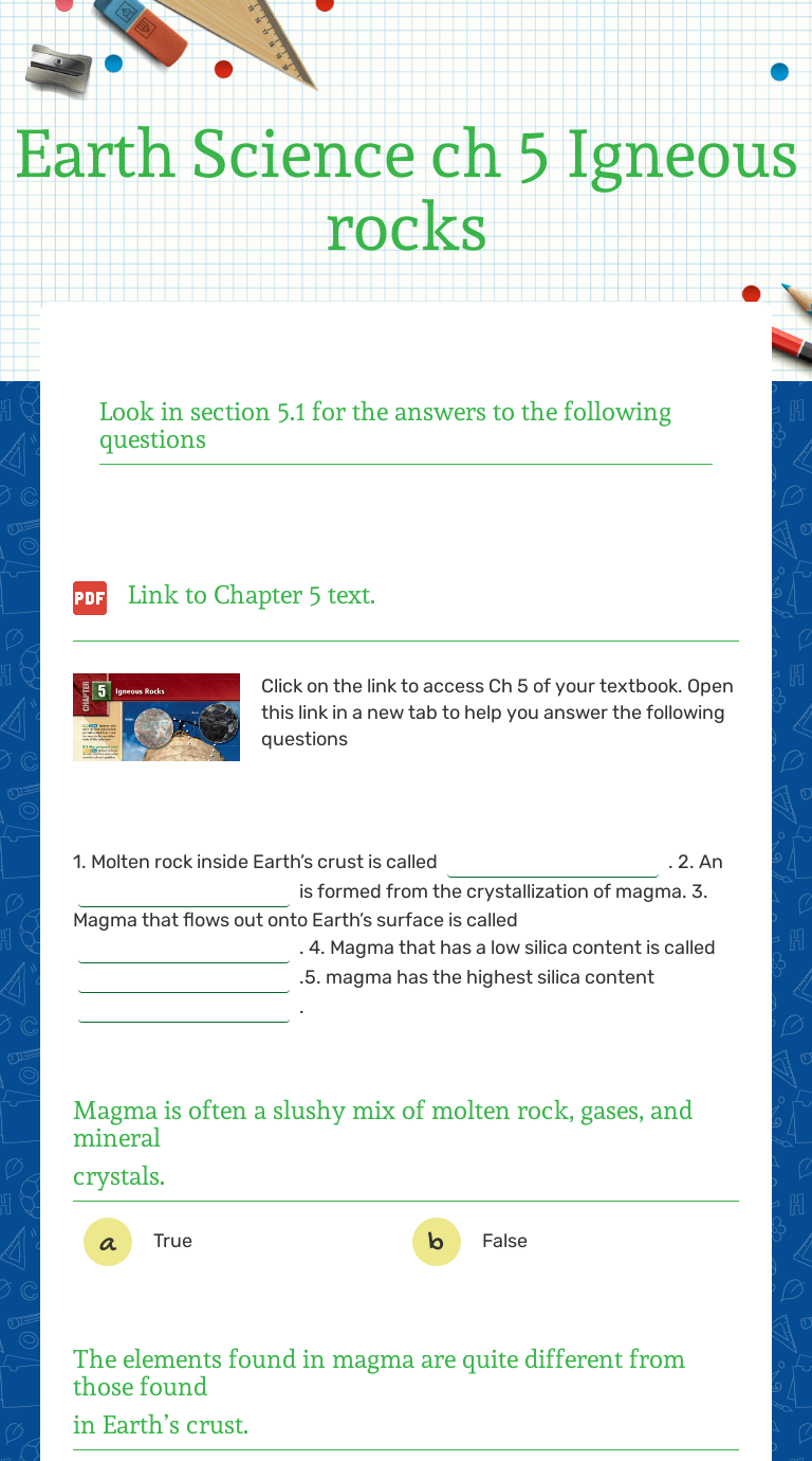 Volcanoes And Types Of Rocks Worksheet from files.liveworksheets.com Chapter 1 introduction to earth science guided. September 1, 2020 by admin. This section discusses the characteristics of igneous rocks. Rocks are made of different minerals. Igneous rocks are formed from the solidification of molten rock material. #2 igneous rocks can form sediments, magma, and metamorphic rocks. Igneous rocks are divided into two categories,extrusive and intrusive. We found some images about igneous rocks worksheet answer key